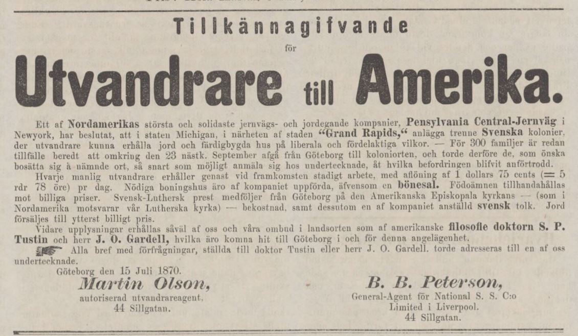 Runt en miljon svenskar emigrerade till Amerika, bland dom, några av oss Nilssons. Nedan är en ”annons” som publicerades i tidningen ‘Kalmar‘ den 24:e augusti 1870. Vem vet, kanske satt [mfm] Albertina Wilhelminas bror Lars Gustaf på Kallegutas utmark, läste denna annons och tänkte; ”Det där låter inte så dumt!”, innan han gjorde slag i saken och reste dit 1873.