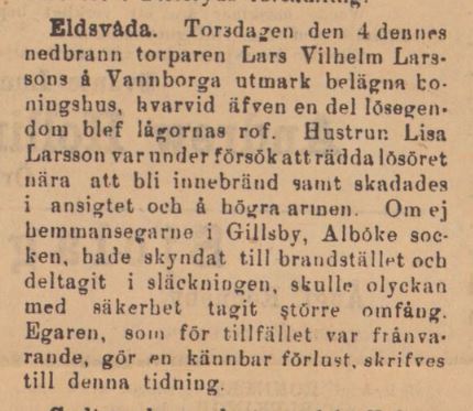 Brita Lisa (Alberts moster) och hennes familj drabbades den 4:e juni 1896 av en olycka då en eldsvåda bröt ut i boningshuset. Nedan är en artikel från Ölandsbladet den 10:e juni samma år.