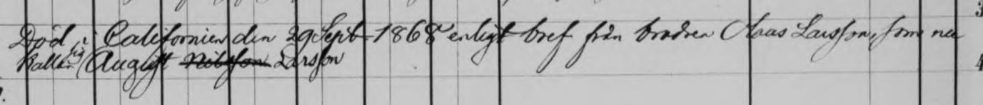 Vad man uppenbarligen inte visste där hemma var att de befann sig i Kalifornien. Kanske var dom där redan 1861-1865 under det amerikanska inbördeskriget. En lockande tanke. Det vi med säkerhet vet är att bröderna befann sig där år 1868 eftersom Olaus, som i Amerika kallar sig August, skriver hem för att berätta att brodern Nils Peter dött den 29:e september 1868. Underrättelsen når de anhöriga först den 21:e november 1869.