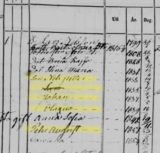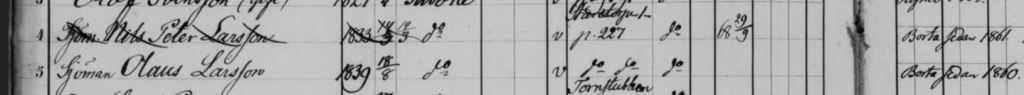 [mf] Gustav Georg Nilsson - 1908-2000 > [mfm] Albertina Wilhelmina Gustafsdotter - 1875-1939 > [mfmm] Brita Kajsa Larsdotter - 1828-1897 > hennes bröder var Nils Peter Larsson - 1833-1868 Lars Larsson - 1835-1894 Olaus Larsson - 1839-1932 Johan Larsson - 1837-1927 Pehr August - 1851-1888
