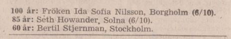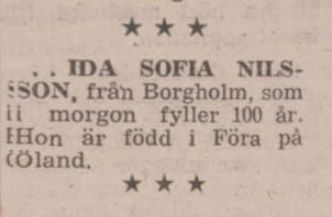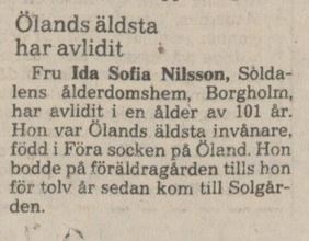 Den person i vår släkt som blivit äldst, med god marginal dessutom, var Ida Sofia Nilsson som blev hela 101 år gammal och var vid hennes bortgång den äldsta personen på hela Öland. Född i Föra den 6:e oktober 1877 och gick bort den 15:e januari 1979.