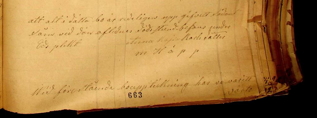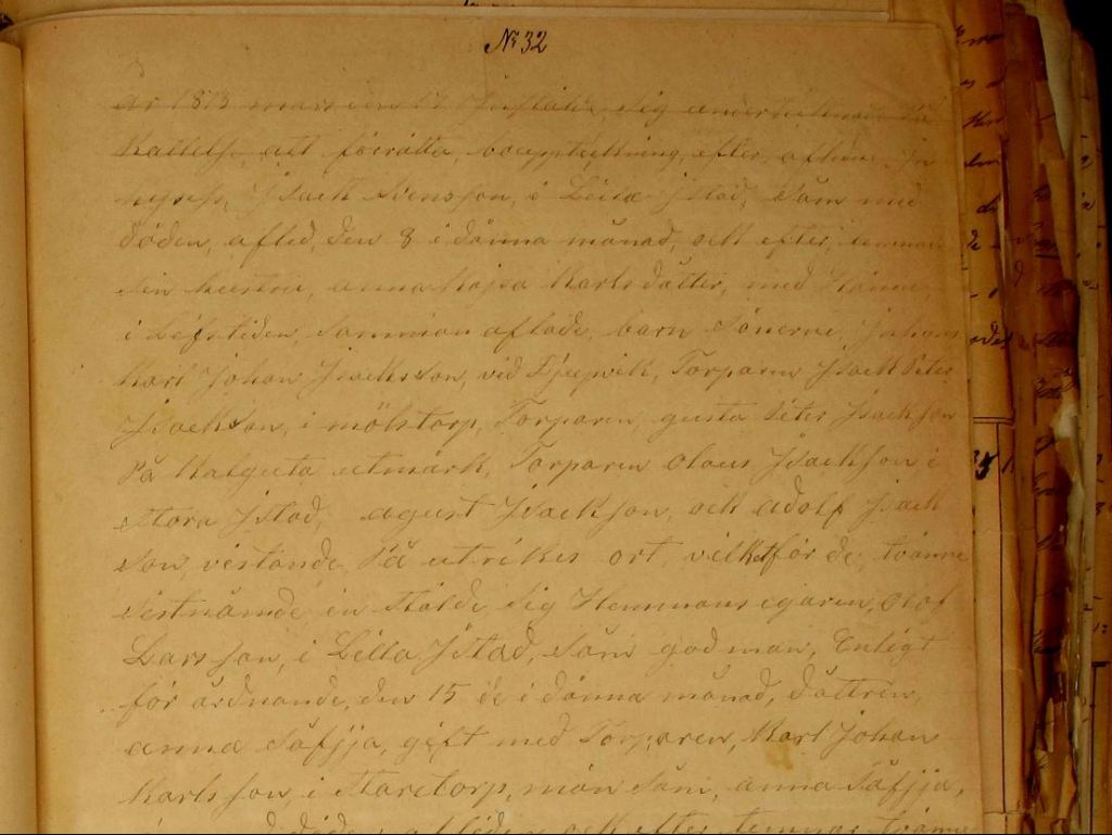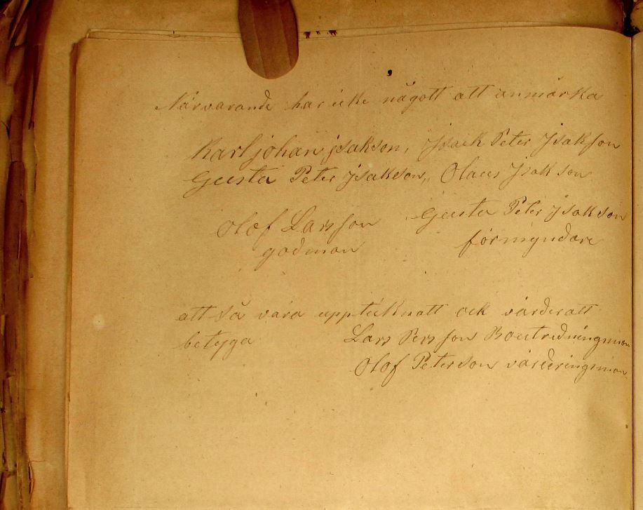 “År 1873 mars den 17 inställde sig undertecknad på kallelse att förrätta bouppteckning efter aflidne inhyses Isack Svensson i Lilla Istad såm med döden afled den 8 i dänna månad och efterlemnar sin hustru Anna Kajsa Karlsdotter med henne i Lifstiden sammanaflade barn Sönerna — Karl Johan Isackson vid Djupvik, Torparen Isack Peter Isackson i Möllstorp, Torparen Gusta Peter Isackson på Kalguta utmark, Torparen Olaus Isackson i Stora Istad, August Isackson och Adolf Isackson vistande på utrikes ort vilket för de tvänne sistnämde inställde sig Hemmansegaren Olof Larsson i Lilla Istad såm god man Enligt förårdnande den 15de i dänna månad, döttren Anna Såfija, gift med Torparen Karl Johan Karlsson i Staretorp, män såm Anna Såfija är med döden afliden och efter lemnar tvänne döttrer, Anna Maria född 12 juni 1848, Karolina född 20 maj 1854 hwilkens rätt bevakades af förmyndaren Gusta Peter Isackson på Kalguta utmark Enligt förårdnande den 23 september 1870 vilka alla vore närvarande, en tästamänte förevistes af den 24 april 1870 såm icke skulle utbetalas — för än efter både makernes död, Enkan tillsades att uppgifva boet sådant såm vid den aflidnes döds stund befans, under Eds plikt och skjedde uppteckning i följande årdning.“