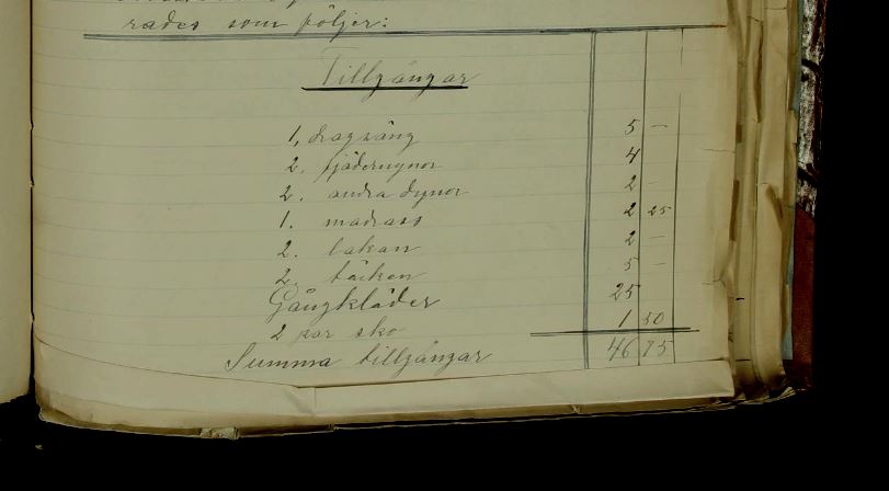Dottern Kristina vilken har dödsboet om hand, tillsades vid eds förpliktelse uppgiva boet sådant det vid den avlidnes dödsstund befanns och antecknades och värderades som följer: