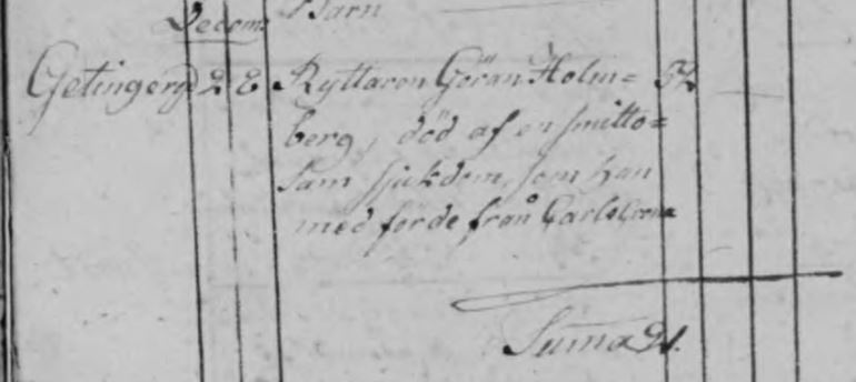 När Gjöran dör hemma i Svarttorp den 2 december 1789 antecknas det i Kyrkoböckerna: ”Ryttaren Göran Holmberg, död af en smittosam sjukdom som han medförde från Carlscrona”.