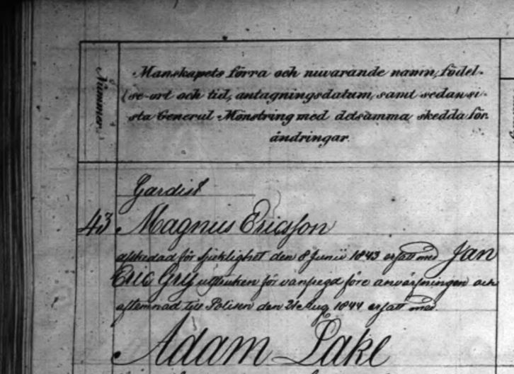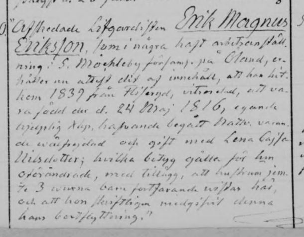 Anteckning från flyttningslängden i Högsby: “Afskedade Lifgardisten Erik Magnus Eriksson som i några haft arbetsanställning i Södra Möckleby församling på Öland, erhåller en attest dit af innehåll, att han hit kom 1839 från Fliseryd — att vara född der d. 24 Maj 1816, egande hjelplig —, hafvande begått nattv, varande wälfredjad och gift med Lena Cajsa Nilsdotter, hvilka betyg gälla för — oförändrade, med tillägg, att hustrun jemte 3 vuxna barn fortfarande wistas här, och att hon skriftligen medgifvit denna hans bortflyttning.”