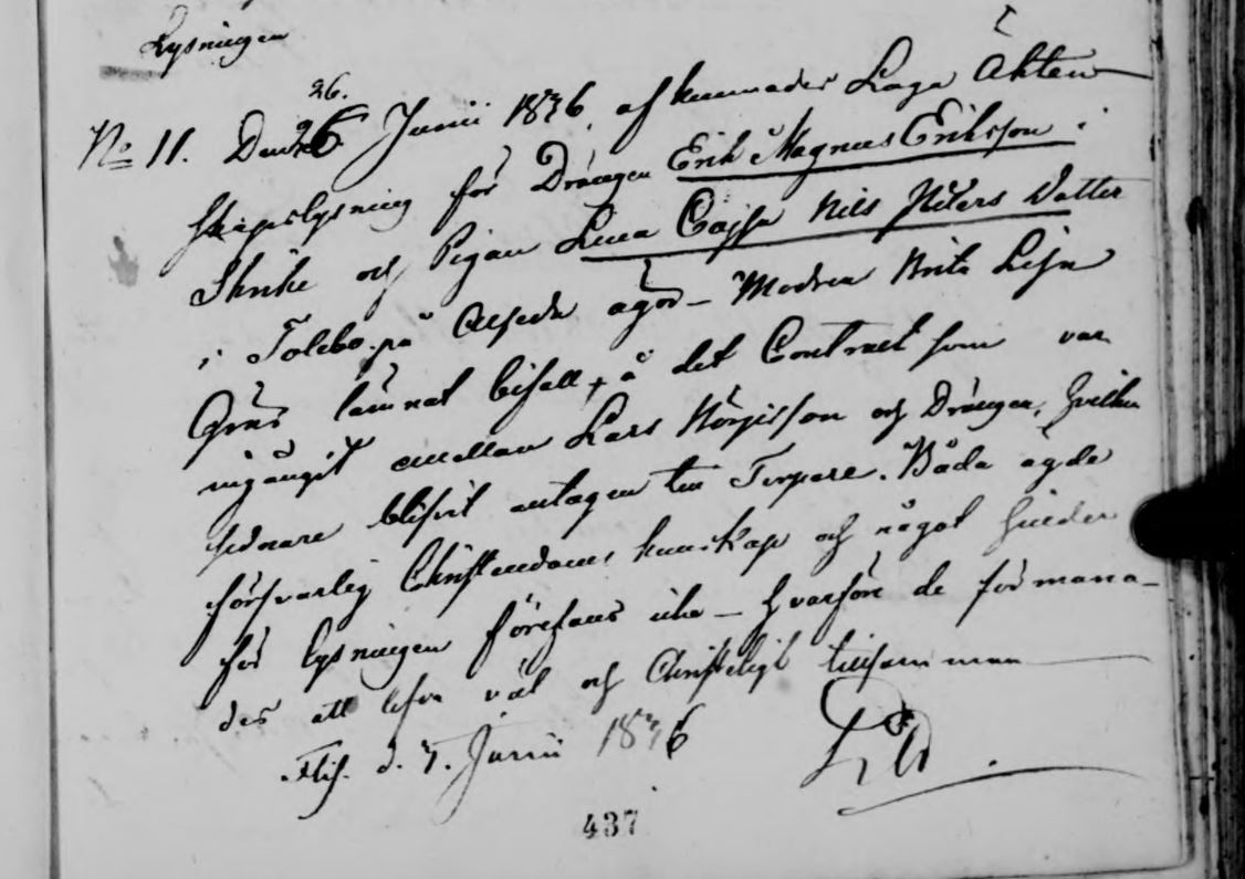 Vid lysningen mellan Lena Cajsa och Erik Magnus antecknades följande: “Den 26 juni afkunnades Laga äktenskapslysning för Drängen Erik Magnus Eriksson i Skrike och Pigan Lena Cajsa Nils Peters dotter i Tolebo på Alseda ägor. Modren Brita Lisa Gräs lämnat bifall å det Contract som var ingångit emellan Lars Börjesson och Drängen, hvilken sednare blifvit antagen till Torpare. Båda ägde försvarlig Christendoms kunskap och något — för lysningen föregavs icke hvarför de förmanades att lefva väl och Christligt tillsammans. Flis. d. 3 juni 1836” .