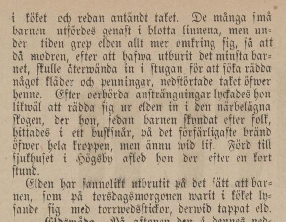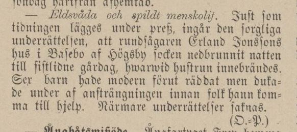 Barometern 5 nov 1877:“- Eldsvåda och spildt menskolif. Just som tidningen lägges under press, ingår den sorgliga underrättelsen, att rundsågaren Erland Jonssons hus i Basebo af Högsby socken nedbrunnit natten till sistlidne gårdag, hwarvid hustrun innebrändes. Sex barn hade modern förut räddat men dukade under af ansträngningen innan folk hann komma till hjelp. Närmare underrättelser saknas.”