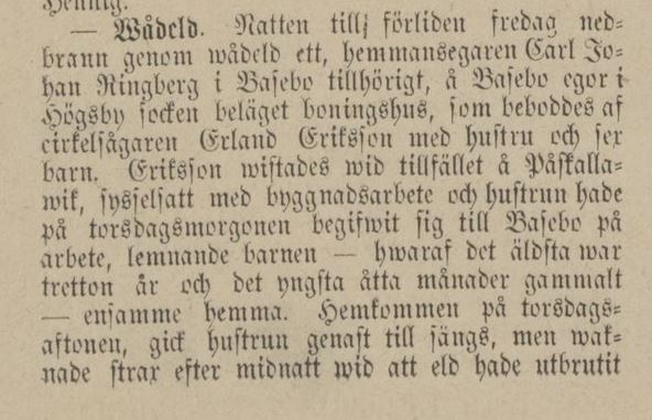 Barometern 10 nov 1877:“- Wådeld. Natten till förliden fredag nedbrann genom wådeld ett, hemmansägaren Carl Johan Ringberg i Basebo tillhörigt, å Basebo egor i Högsby socken beläget boningshus, som beboddes af cirkelsågaren Erland Eriksson med hustru och sex barn. Eriksson wistades wid tillfället å Påskallawik, sysselsatt med buggnadsarbete och hustrun hade på torsdagsmorgonen begifwit sig till Basebo på arbete, lemnande barnen – hwaraf det äldsta war tretton år och det yngsta åtta månader gammalt – ensamme hemma. Hemkommen på torsdagsaftonen, gick hustrun genast till sängs, men waknade strax efter midnatt wid att eld hade utbrutit i köket och redan antändt taket. De många små barnen utfördes genast i blotta linnena, men under tiden grep elden allt mer omkring sig, så att d modren, efter att hafwa utburit det minsta barnet, skulle återwända in i stugan för att söka rädda något kläder och penningar, nedstörtade taket öfwer henne. Efter oerhörda ansträngningar lyckades hon likwäl att rädda sig ur elden in i den närbelägna skogen, der hon, sedan barnen skyndat efter folk, hittades i ett busksnår, på det förfärligaste bränd öfwer hela kroppen, men ännu wid lif. Förd till sjukhuset i Högsby afled hon der efter en kort stund.”