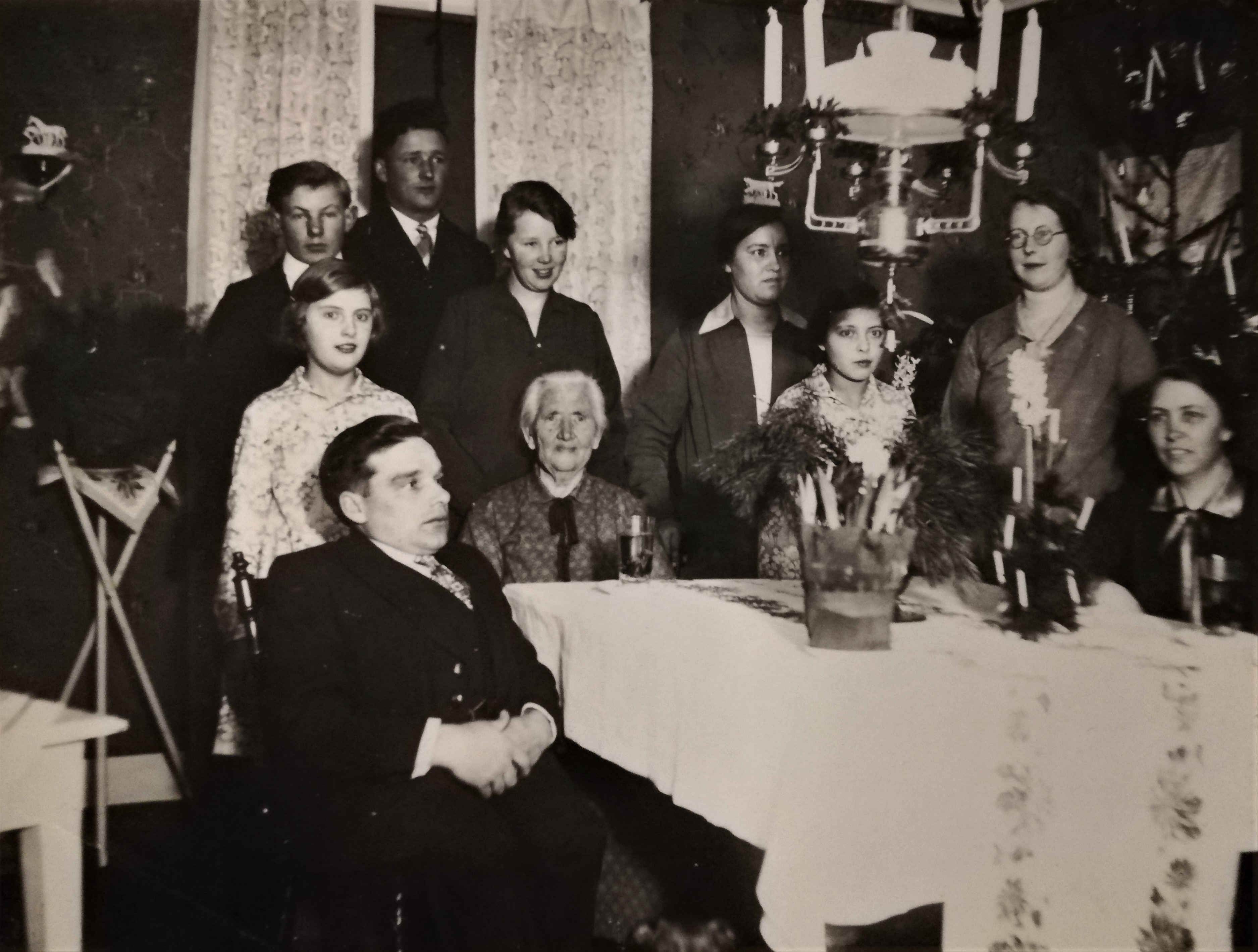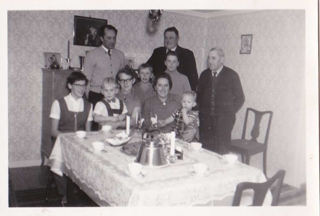 [4] Längst till vänster är Albert, framför honom står Gust. Pojken bakom Albert är Edvin. Flickan som serverar är Gerda. Längst till höger sitter Wilhelmina med Karin i knät.