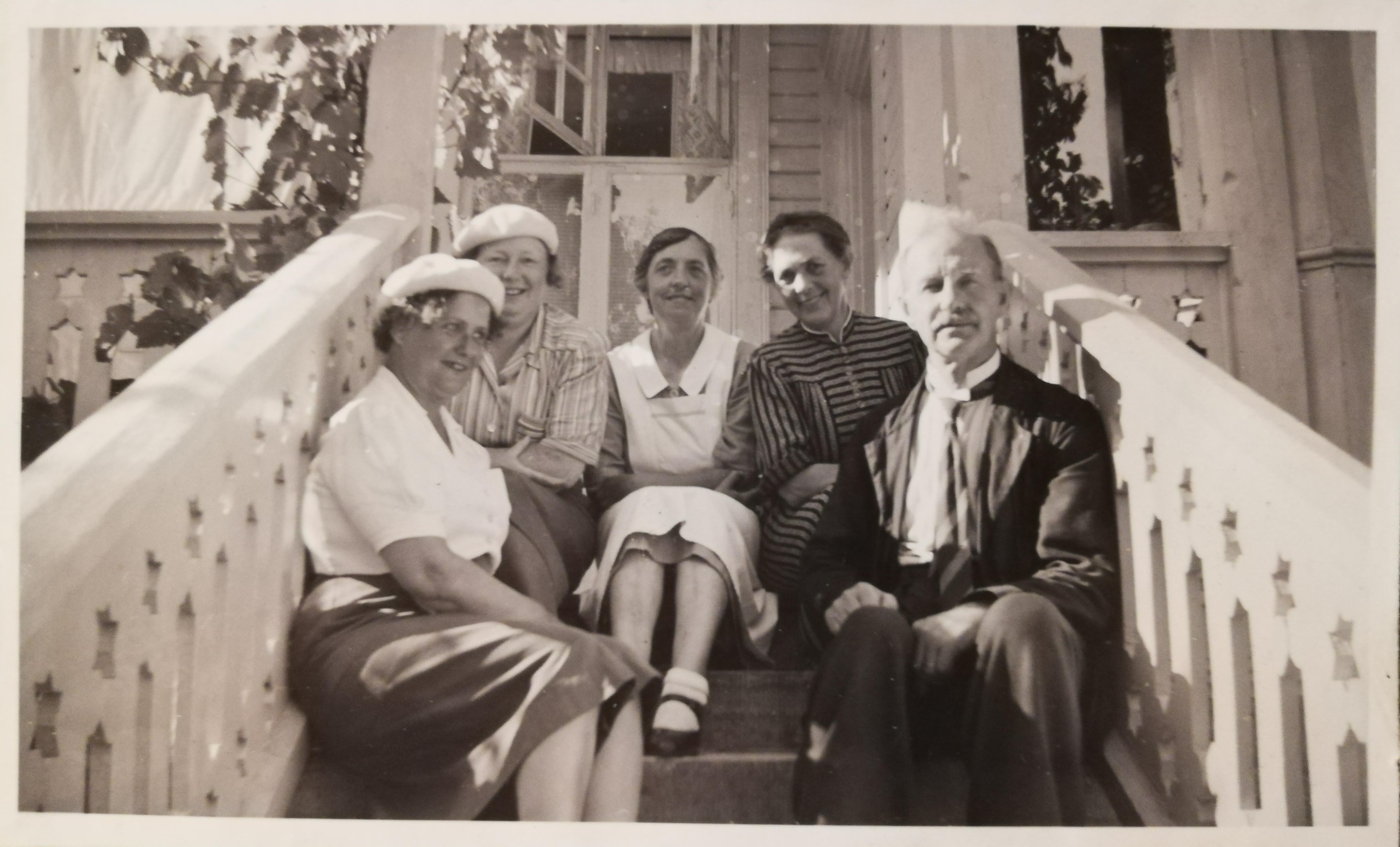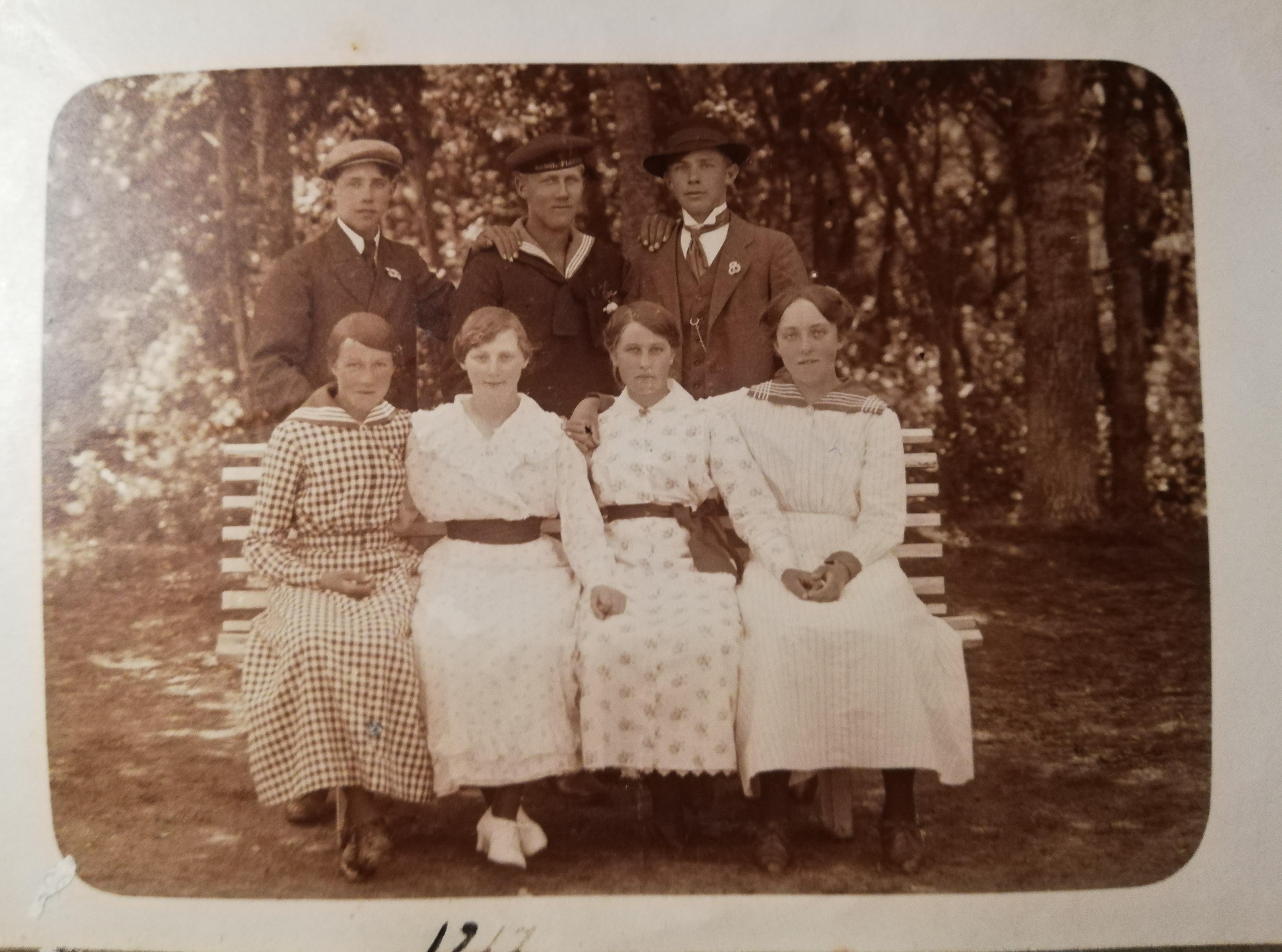[5] Sittandes från vänster: Irma, okänd, Dagny, Karin, okänd. Stående från vänster: Allan, okänd, Emrik, Bertil, Albert.