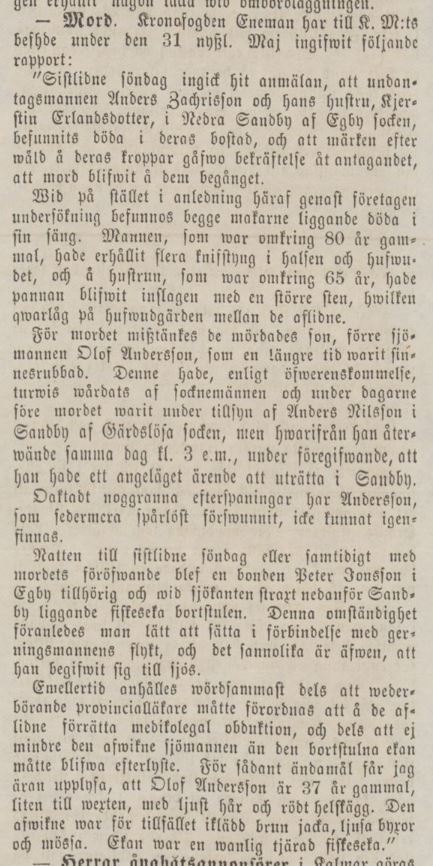 Barometern 4:e juni 1870: ”Sistlidne söndag ingick hit anmälan, att undantagsmannen Anders Zachrisson och hans hustru, Kjerstin Erlandsdotter, i Nedra Sandby af Egby socken, befunnits döda i deras bostad, och att märken efter wåld å deras kroppar gåfwo bekräftelse åt antagandet, att mord blifwit å dem begånget.