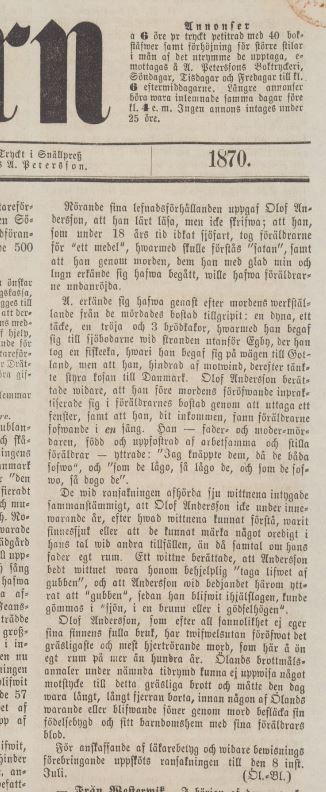 Barometern 3:e Augusti 1870: ”- Från Borgholm. Föräldramördaren, förra sjömannen Olof Andersson från Sandby, Egby socken, war förliden thorsdag för ytterligare ransakning rörande detta mord inställd för ortens domstol, derwid han widhöll hwad han förut om samma brotts föröfwande erkänt.