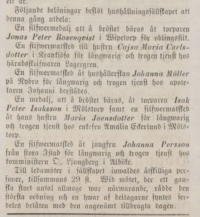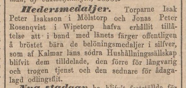 ”En medalj, att å bröstet bäras, åt torparen Isak Peter Isaksson i Mölstorp samt en silfvermatsked åt hans hustru Maria Joensdotter för långwarig och trogen tjenst hos enkefru Amalia Eckerlund i Mölstorp.”