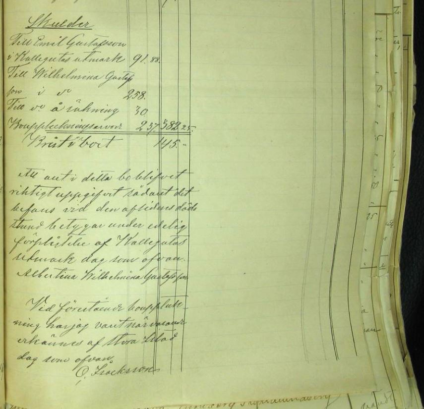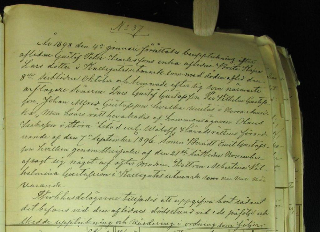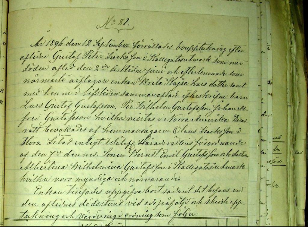 “År 1896 den 12 September förrättades bouppteckning efter aflidne Gustaf Peter Isacksson i Kallesgutas utmark som med döden afled den 2:e sistlidne juni och efterlemnade som närmaste arftagare enkan Brita Kajsa Larsdotter samt med henne i lifstiden sammanaflade efterskrifne barn Lars Gustaf Gustafsson, Per Wilhelm Gustafsson, Johan Alfrid Gustafsson hvilka vistas i Norra Amerika. Deras rätt bevakades af hemmansägaren Olaus Isacksson i Stora Istad enligt — Häradsrättens förordnande af den 7:e dennes. Sonen Berndt Emil Gustafsson och dottren Albertina Wilhelmina Gustafsson i Kallegutas utmark hvilka voro myndiga och närvarande.