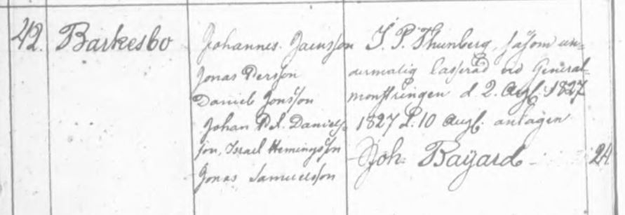 ”J.P. Thunberg såsom undermålig casserad vid Generalmönstringen d. 2. aug. 1827. 1827 d. 10 aug antagen Joh. Bayard”