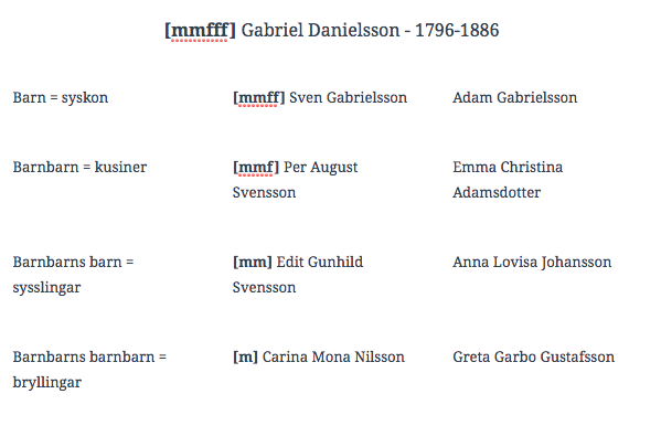 Nedan är beskrivet hur vi Nilssons hör ihop med Greta Garbo. Den gemensamma nämnaren är Gabriel Danielsson som föddes den 6:e maj 1796 i Basebo, Högsby. Två av hans söner, Sven och Adam, bildade så småningom egna familjer som till slut, tre generationer bort, producerade bryllingarna Carina och Greta.