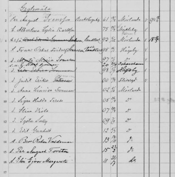 Sedan börjar barnafödandet på allvar. Mellan åren 1895-1918 får dom 13(!) barn. 9 flickor och 4 pojkar; Frans Oskar Fridolf f. 1895, Martha Maria f. 1897, Lisa Elvira f. 1898, Judit Erika f. 1900, Anna Linnéa f. 1902, Karl August Emanuel f. 1904, Signe Hulda Terese f. 1905, Stina Viola f. 1907, Syster Sally f. 1909, Edit Gunhild f. 1912, Bror Ruben Valdemar f. 1913, Elin Eivor Margareta f. 1918 och Per August Torsten f. 1915.