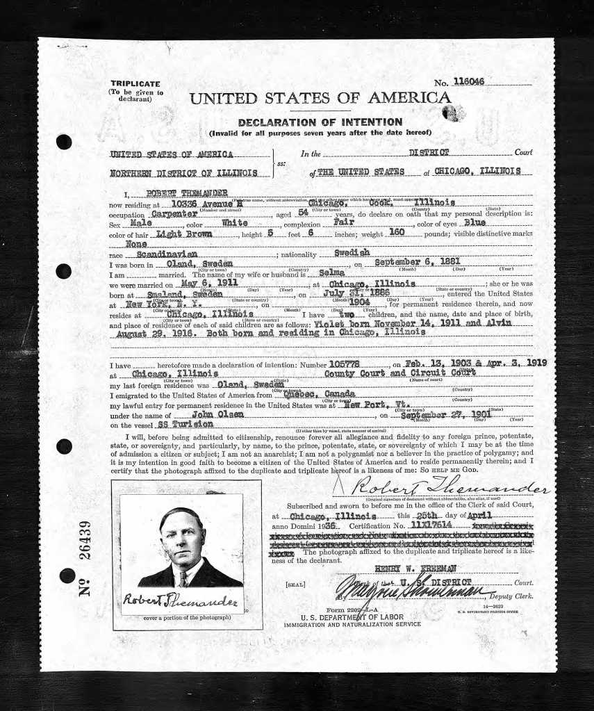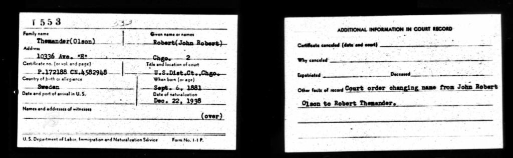 Han var lite svår att lokalisera eftersom han, väl landstigen i Amerika (via Liverpool och Quebec), blev till John Robert istället för Janne Rubert. När han ändå var i farten så passade han också på att byta efternamn från Olsson till Themander. Det senare dokumenterades i samband med naturaliseringsprocessen i december 1938 (bild nedan).