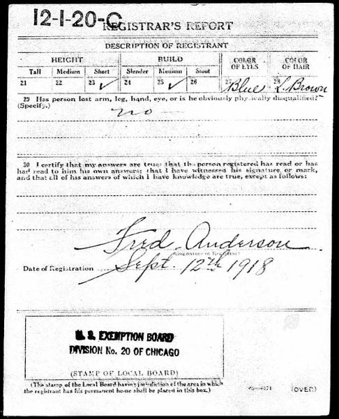 Med två små barn och (förmodligen) fru att försörja blir han år 1918 inkallad att tjänstgöra i 1:a världskriget. Däremot tror jag att han slapp undan. Hans ”registration card”, som är daterat till den 12:e september 1918 bär stämpeln ”U.S. EXEMPTION BOARD”.