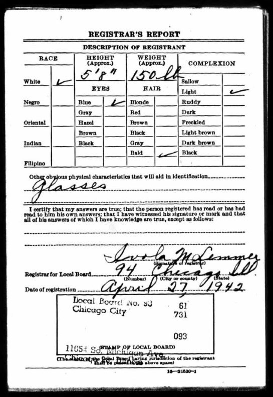 Samma tur verkar han inte ha haft när 2:a världskriget startade. Här finns inga stämplar som sätter någon på undantag. Den 27:e april 1942 i Chicago så blir han värvad för militärtjänstgöring. Han är enligt rapporten 60 år gammal, flintskallig och bär glasögon.